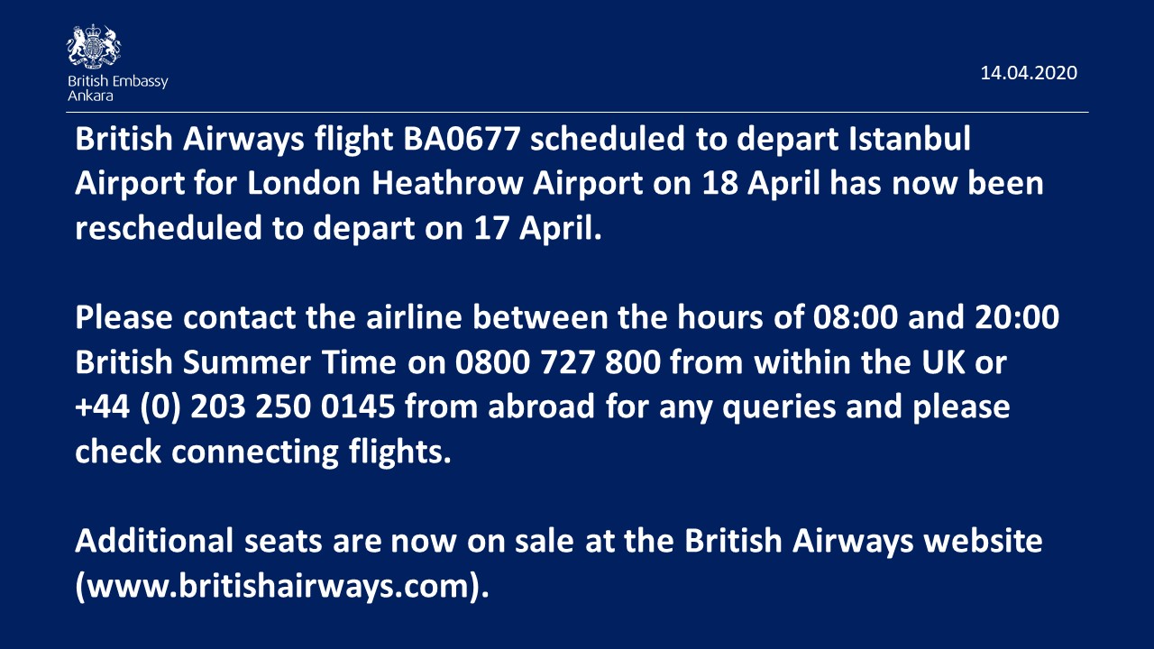 British Embassy On Twitter British Airways Flight Ba0677 Scheduled To Depart Istanbul Airport For London Heathrow Airport On 18 April Has Now Been Rescheduled To Depart On 17 April Https T Co Cqkgxnkyvh